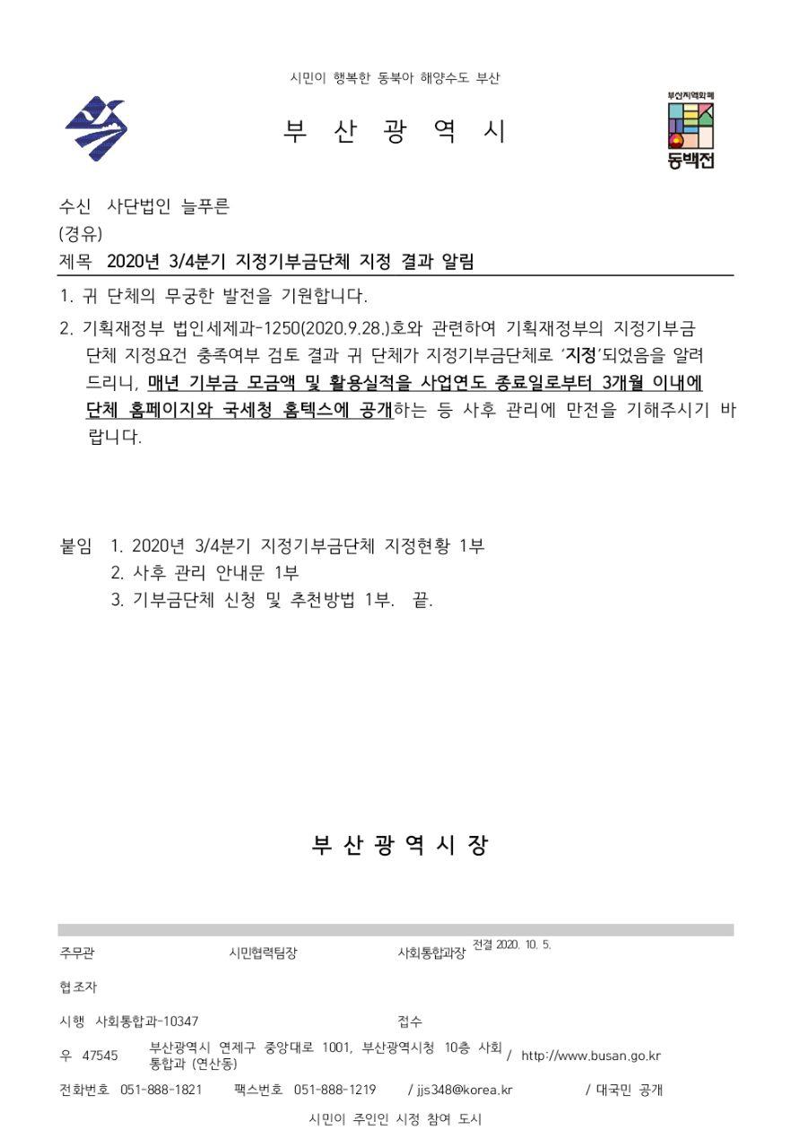 지정기부금단체 지정 결과[부산시 공문] 관리자ㅣ2020.10.13ㅣ27302 첨부파일 2020년 34분기 지정기부금단체 지정 결과 알림.jpg[0.08MB] 지정기부금단체 지정 결과[부산시 공문] 목록 이전글 늘푸른 정기총회 및 장학금수여식 장소 변경 알림 다음글 2021년 제11차 정기총회 및 제13회 장학금수여식 개최 알림