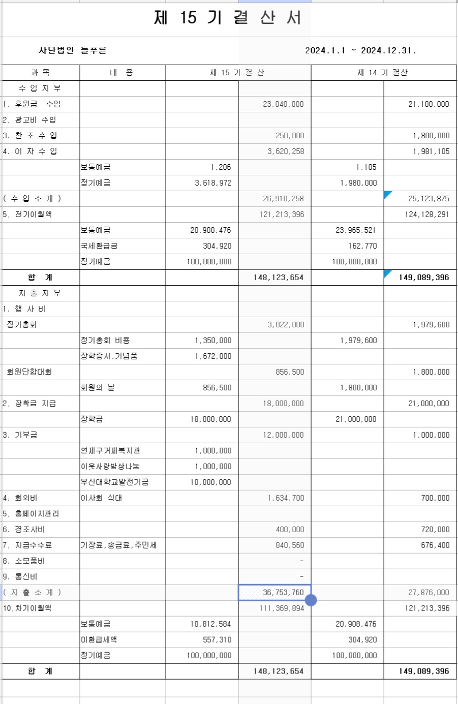 늘푸른 제15기 결산서(20241.1.~2024.12.31.) 관리자ㅣ2025.04.27ㅣ4759 첨부파일 제15기 결산서.jpg[0.24MB] 늘푸른 제15기 결산서(20241.1.~2024.12.31.) 목록 이전글 제16회 늘푸른 장학생 선발 안내(신청서 다운로드) 다음글 다음글이 없습니다.