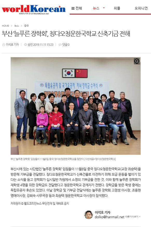 부산 ‘늘푸른 장학회’, 칭다오청운한국학교 신축기금 전해(월드코리안뉴스) 관리자ㅣ2019.11.14ㅣ11286 첨부파일 Cap 2019-11-14 23-33-50-319.jpg[0.14MB] 월드코리아뉴스 2019. 11. 11. 송고 보러가기 ==> http://www.worldkorean.net/news/articleView.html?idxno=35652 목록 이전글 사단법인 늘푸른장학회, 정기총회 및 장학금 수여식 개최(국제신문) 다음글 2024년 부산대학교 발전기금 약정식