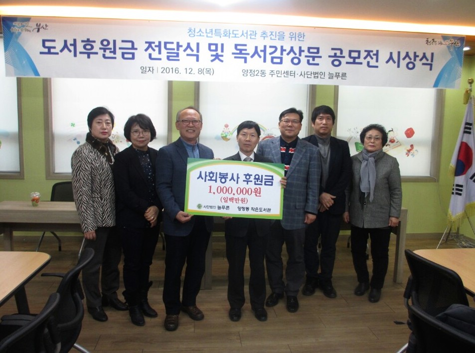 양정동 작은도서관 도서후원금 전달(2016. 12. 8) 관리자ㅣ2016.12.09ㅣ27533 첨부파일 2016-12-09_152700.jpg[0.11MB]2016-12-09_152712.jpg[0.14MB] * 양정동 작은도서관 도서후원금 전달식 - 일시 : 2016년 12월 8일 오후 4시 - 장소 : 양정2동 주민센터 3층 목록 이전글 제2회 회원의 날(2016. 7. 9) 다음글 제9회 늘푸른장학생 선발 심사 및 송년회 행사