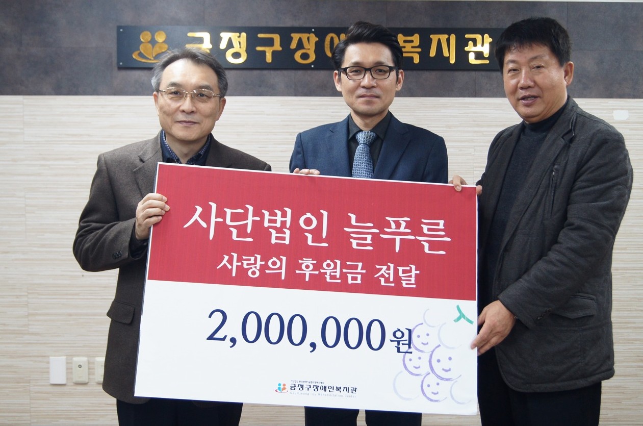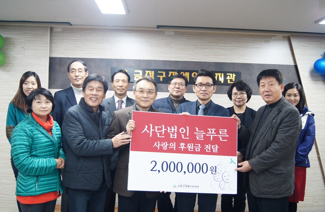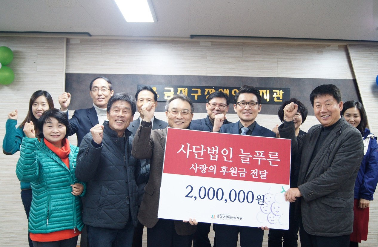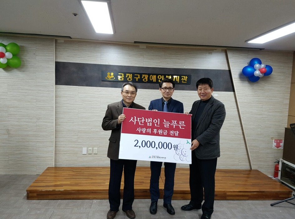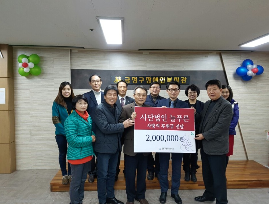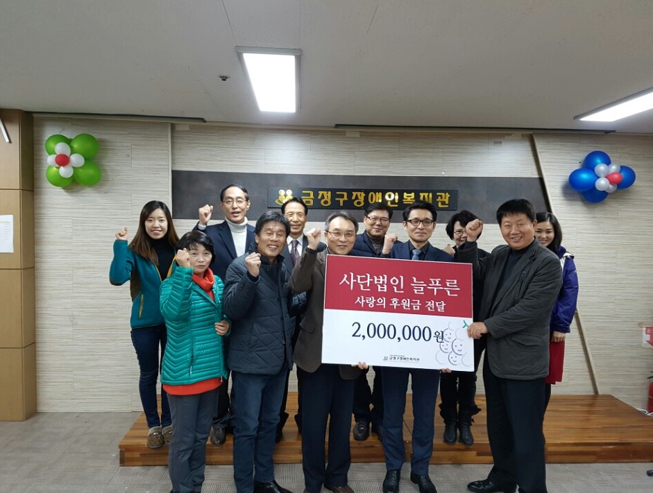 금정구 장애인 복지관 사랑의 후원금 전달식(2016. 12. 26.) 관리자ㅣ2016.12.27ㅣ27612 첨부파일 2016-12-27_082451.jpg[0.14MB]2016-12-27_082437.jpg[0.2MB]2016-12-27_082503.jpg[0.14MB]2016-12-27_082353.jpg[0.24MB]2016-12-27_082521.jpg[0.14MB]2016-12-27_082424.jpg[0.23MB] * 금정구 장애인 복지관 사랑의 후원금 전달식 - 일시 : 2016년 12월 26일 오후 5시 - 장소 : 서동 금정구장애인복지관 목록 이전글 제9회 늘푸른장학생 선발 심사 및 송년회 행사 다음글 2017년 늘푸른 정기총회 준비위원회 & 집행이사회